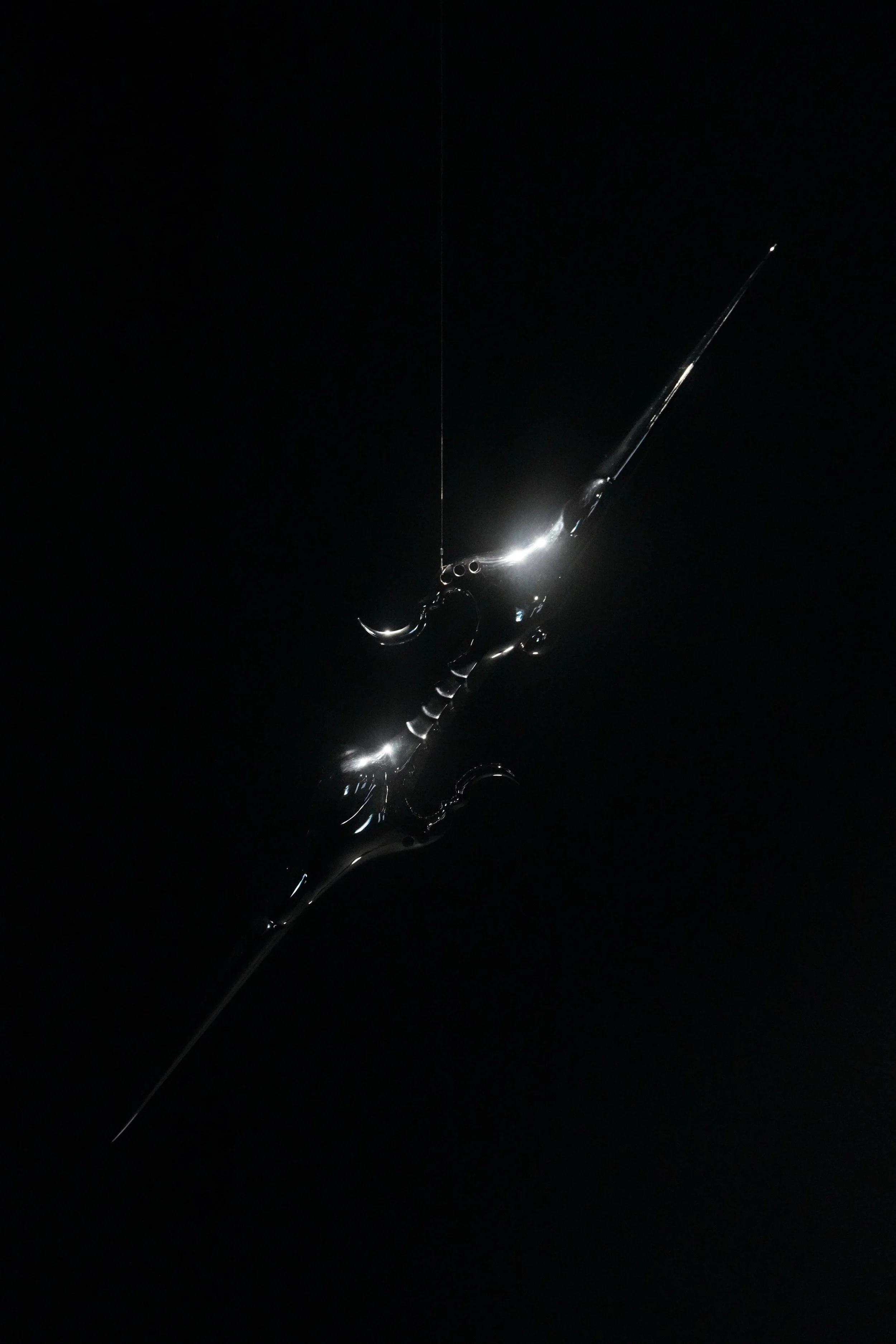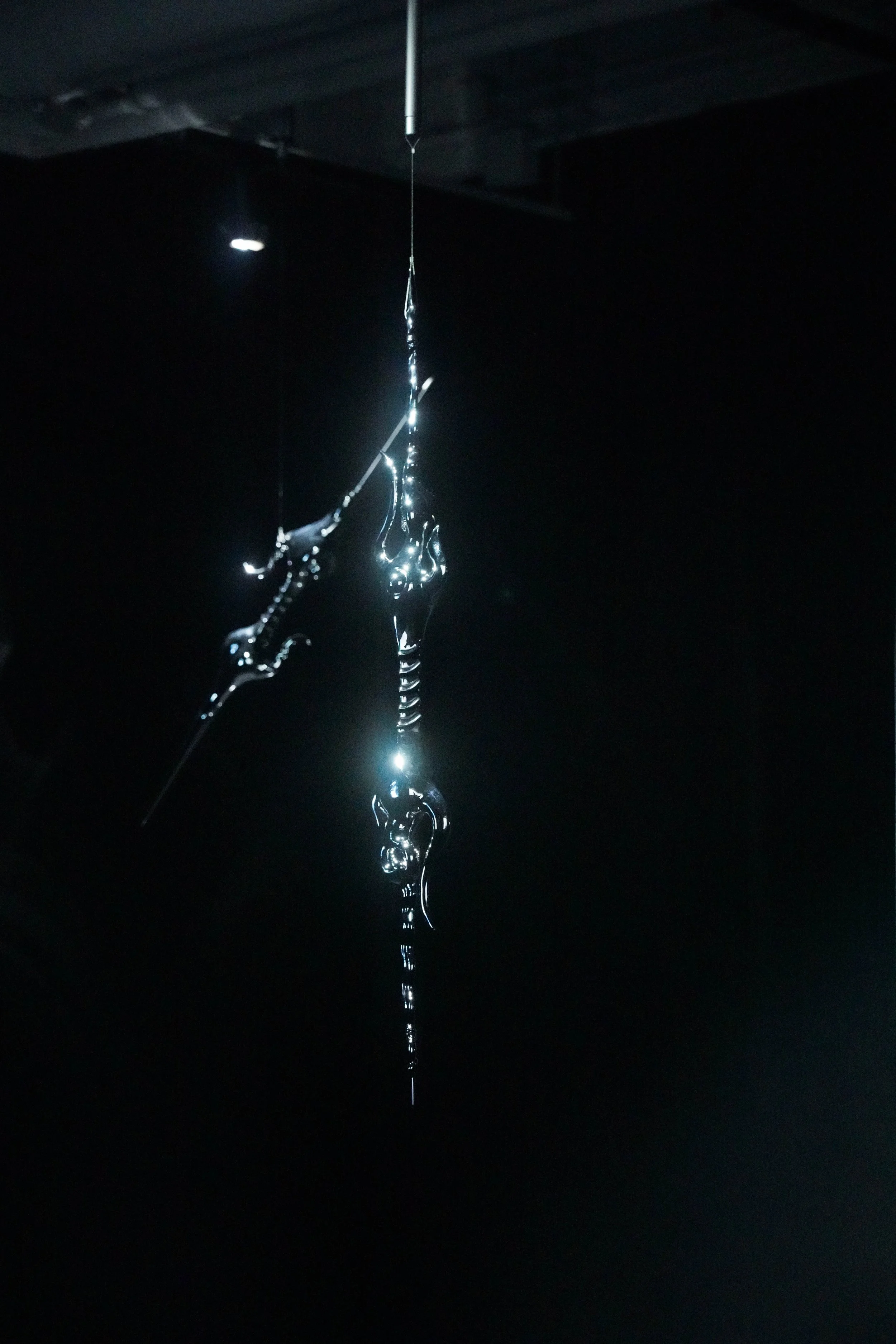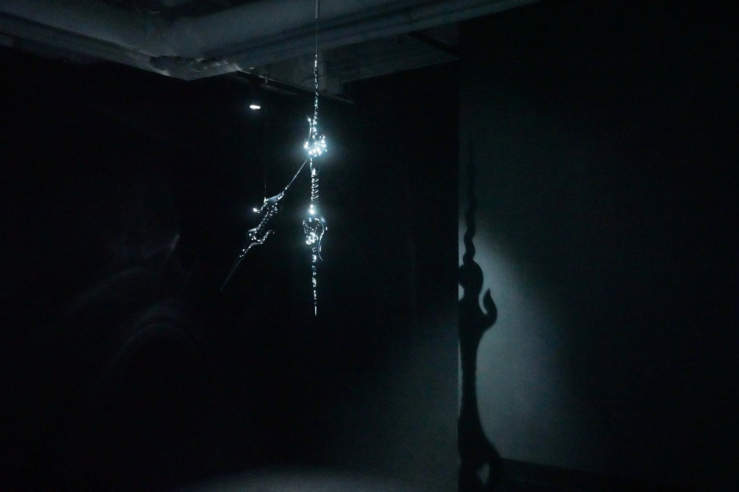 This reclamation continues in Serpents, a pair of electro-plated 3D-printed swords worn in the performance Relics. Reimagining pre-colonial Filipino weapons archived in Western institutions, the work questions erased lineages and displaced indigenous knowledge. Reconfigured here as a kinetic installation, the swords move in a state of perpetual flux—ascension and descension, obliteration and resurrection. This mechanic reactivates the double swords, transforming a weapon of war into a ritual tool for healing. It confronts the resonance of amnesia and remembrance, asking how a body becomes a relic cracking the endurance of migration and colonization, rejuvenates again.