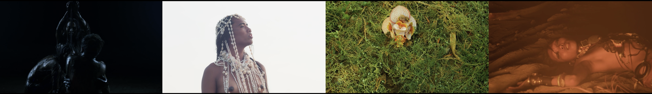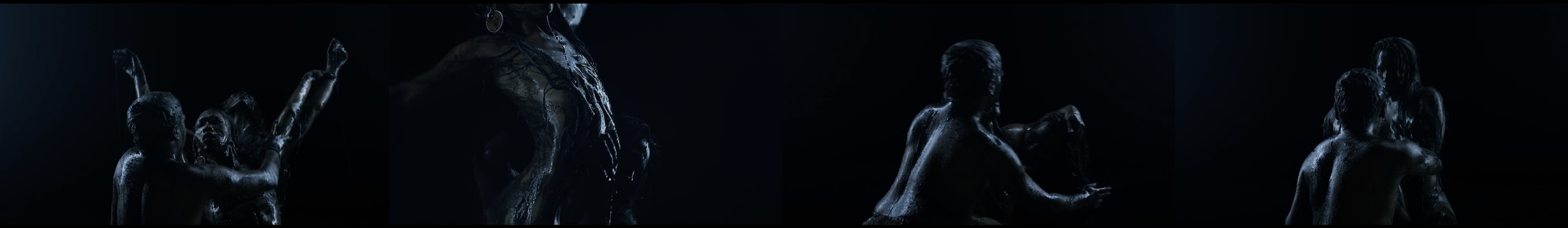 The exhibition transitions into Cosmological Gangbang, a previous cosmological project that decolonizes the cis-heteronormative iconographies implemented by the West in the Philippines. By referencing pre-colonial gender and belief systems, Serafin rewrites and speculates a Filipino identity that is fluid and divine. Creation Paradigm is a four-channel video projection featuring queer performers Bunny Cadag, Lukresia Quismundo, and John Chesleigh Nofiel as contemporary babaylans (shamans). Together, they world a new cosmology through incarnating the goddesses Uling (light and dark), Talu (the reflection of oneself), and Waling-Waling (the euphoria of love). Their divine union is mediated by the "Void," a primordial black swamp that procreates a new deity from the collective.