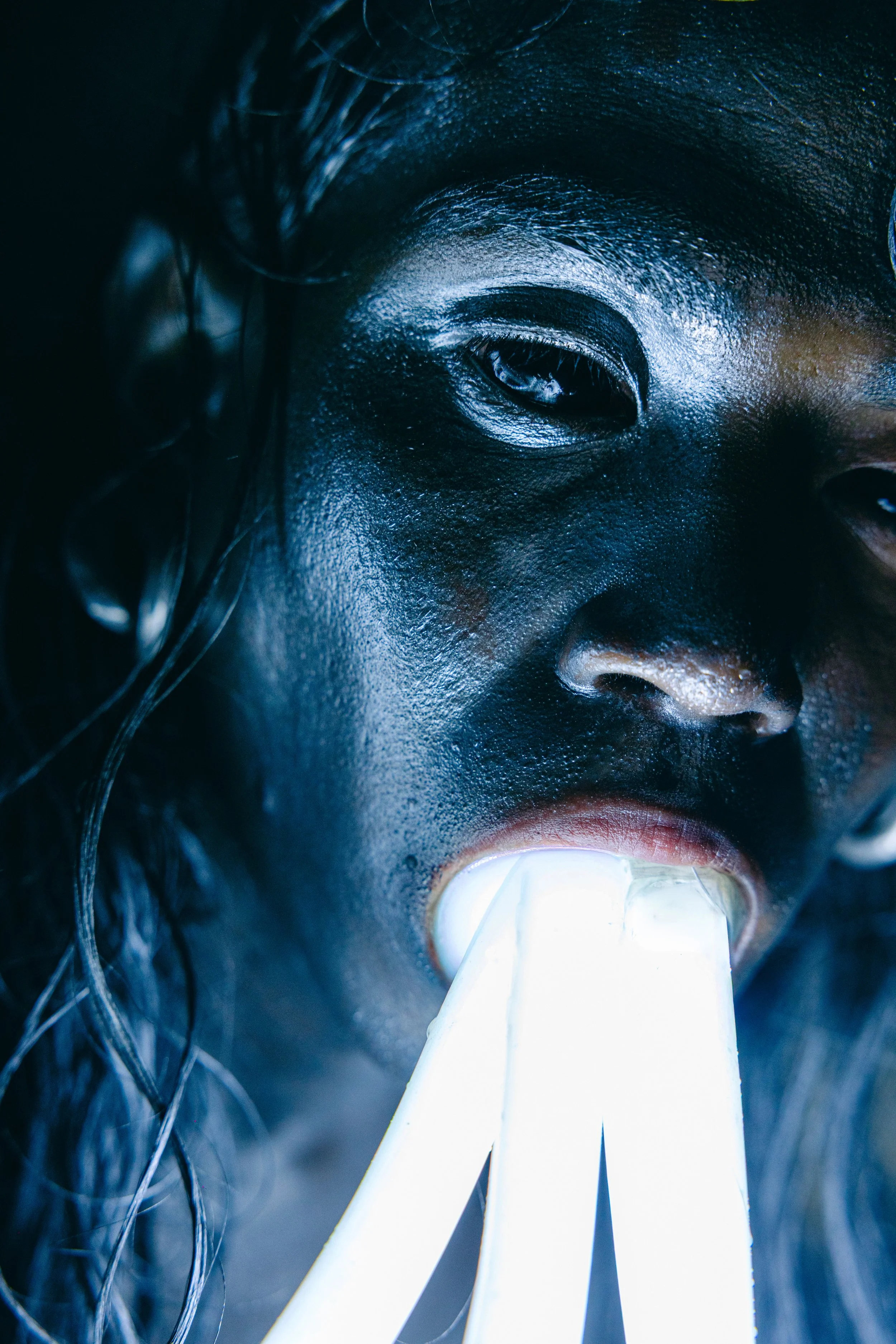 The journey begins with Lost Ancestors, Serafin’s ongoing research into their forgotten family history. Rooted in the story of their great-great-grandfather, Shentaro Esaki—a Japanese migrant worker who moved to the Philippines in 1909—the work unearths a genealogical heritage tangled with a colonial past. In the lightbox photographs Void and Relics, the body becomes a threshold. The former captures Serafin covered in black liquid and pearls under a celestial gaze; their translucent, cataract-white pupils radiate a "blindsight" that connects the mortal vessel to the ancestral spirit. The latter resembles a post-mortem ritual: Serafin’s mutated, bluish skin is enchanted by light strips emanating from the mouth, returning a voice to ancestors long silenced by history.