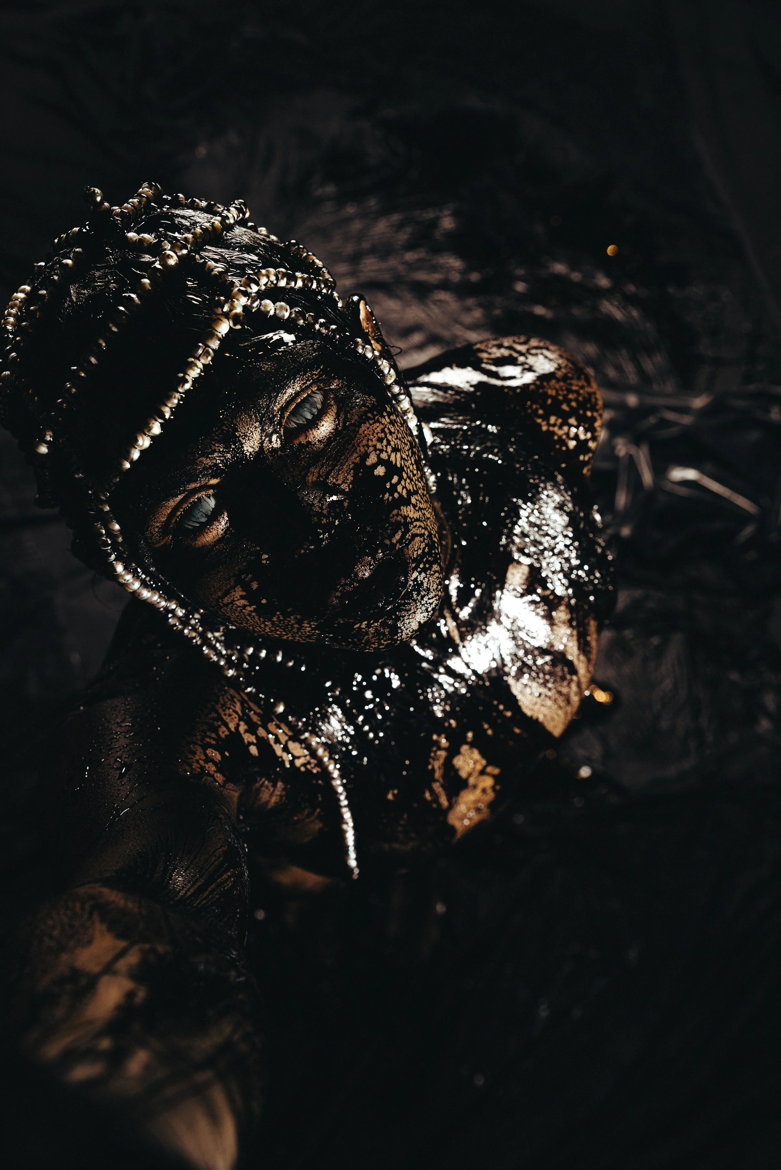 The scenographic manifestation of the Void is reconstructed as a floor installation of black ooze and soil. This black swamp is a vessel of spectral, stagnant fluids that absorb and unleash generational pain. It acts as a portal connecting a pre-colonial past to a speculative future beyond the written temporality of colonization. By proposing the arrival of a new god within a doomed present, the installation refounds a new kind of humanity—one born from the primordial muck of the marginalized. It is an invitation to witness the coming-to-life of a self-regulating organism that governs the cycle of the cosmos: giving, balancing, and ending life. This culminates in a series of canvas works—action paintings that encapsulate choreographed movement. These canvases encompass the artist's physical remnants: hair, sweat, soil, pearls, silicone, and paints that archive apocalyptic moments of homesickness, violence, heartbreak, and melancholy. Decomposed in the body and recomposed in action, these elements reside on the canvas as a texture of the affective and a scent of the atmospheric.